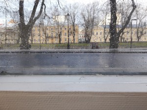 Sade on lakannut, vesi virtaa vuolaana jalkakäytävän reunaa alamäkeen. En ole ennen tullut ajatelleeksi, että maa viettää kävelysiltaa kohti, en ole ennen katsonut, kun vesi virtaa gallerian ohi jalkakäytävällä.
